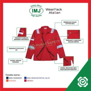 Baju atau seragam kerja lapangan lengan panjang merk IMJ berbahan Cotton 100% dengan kualitas tinggi, terdapat scotlight 3M pada baju untuk memantulkan cahaya pada saat gelap dan anti percikan api. Sudah disertai logo bendera Indonesia di lengan kanan.