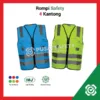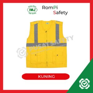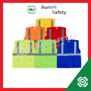 Rompi kerja safety merk IMJ 2 kantong berkualitas bagus untuk kerja proyek, nyaman digunakan dan scotlight yang menyala.